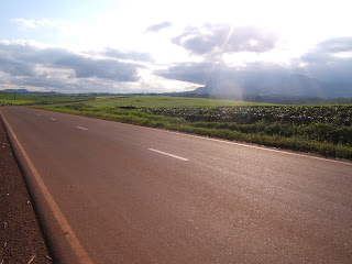 When we got to the village at the bottom of the hill we met A and regrouped with a wonderful apple cake, fresh pineapple, and an attentive audience consisting of pretty much the whole village (see photo). R had by this point acquired 2 more punctures on the decent, and his front tyre was still leaking air. As he rides so much faster than us, and we were beginning to get fairly wierded-out by the odd celebrity attention we were getting from the villagers, Rach and I decided to head off. Next stop, the Mozambique Border!