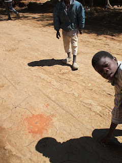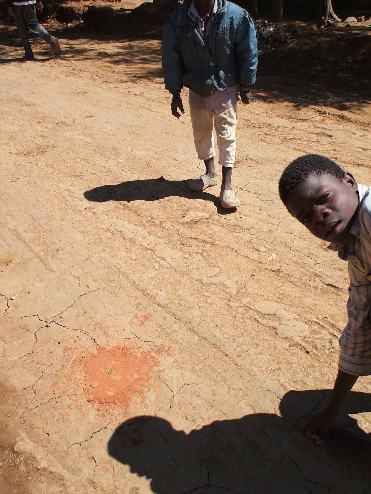 Kids playing a game where you have to throw coins into a specified area, and you can knock other people's coins out. I'm not sure if the winner keeps all the coins or not.