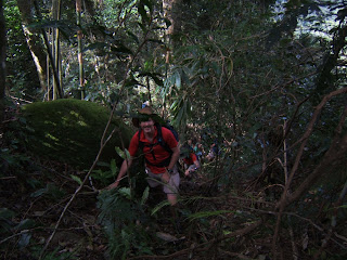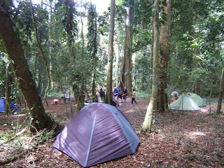 The views from the top were a welcome change from the dense forest, which has it’s own beauty but also seems intent on causing as much discomfort as possible to those wishing to pass through it! We hung around on top for a while, noting species (I spotted a bush full of insects which were mimicking scorpions. I had read about these, they are reckoned to be unique to Mabu). Then dashed back down, getting to the camp just before dark. Another wash in the river, sorely needed, and then a lovely evening of sitting around the campfire, chatting, occasionally heading off to a bush to find the native pygmy chameleons (sorry, none of my photos of these inch long little beasts came out), and generally enjoying the rainforest.