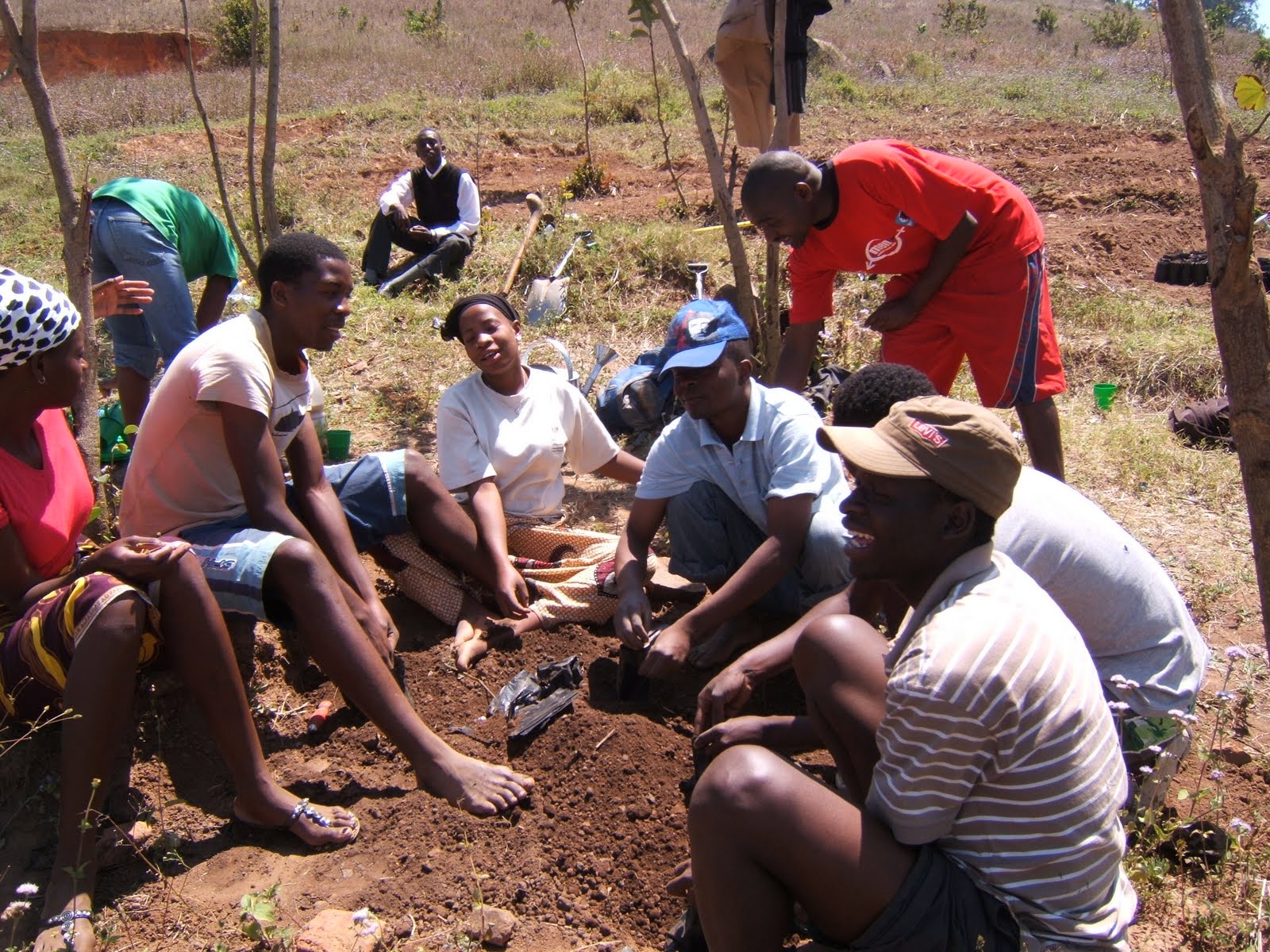 Last week I ran a tree nursery work camp at the Bangwe Youth Centre. Hot work in the sun, so we only worked until noon each day to avoid the heat of the day. The work camp was really quite well attended, for a local non-residential camp. These have tended not to get quite such dedicated commitment, as people are tempted off to do all the other things they need to get on with, and only turn up as and when they feel like it. The camp ran for 4 days, and most days I think we had between 6 and 10 AYISE volunteers, plus myself and 2 of the new Swedish volunteers (Malin – pronounced Maulin, and Joel pronounced Yooel). Day 1 was dedicated to clearing the land upon which we would host our tree nursery. This was really hard physical graft, and I was worried that might deter some people from returning for day 2. But return they did, and were rewarded with much less physical work as most of the land had by this point been leveled, and so the only really physical work was gathering good soils to plant the seeds in, and water.