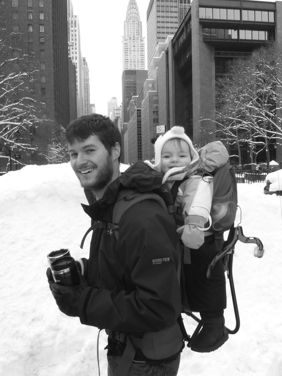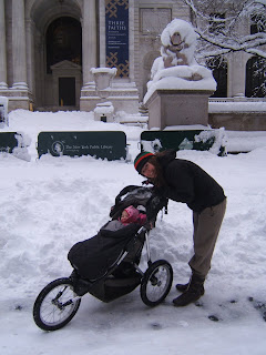 We have spent the week going to music class (again I think I enjoyed that more than May, although she does have some mean moves on her!), playing with trains, reading books and walking in the snow. As I said, 14 inches fell the other night, with more forecast to start any moment now. After our trip downtown this morning using the 'baby rucksack', I think Andy is feeling particularly at home - its like being in the hills except the valleys are carved out between skyscrapers, the snow drifts have cars hidden beneath them and there is a baby in his rucksack!!