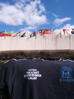 From Namiyango to New York: one of our thank you gifts from AYISE outside the UN Building with Malawian flag in the background (note the risen sun to illustrate the completion of Malawi's development).