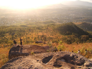After that, a further steep decent took us to a series of unofficial fields with beaten paths which we bashed our way through, and into Limbe (the town nearest to Bangwe township). We crossed through Limbe and approached the final hill, Mount Soche. After a final stop for tea and changing plasters and socks (I had 5 blisters by this point, all on my left foot oddly enough!), we headed off through the Soche township to the hill. Along the way we were adopted by a group of kids who accompanied us all the way to the top! The top of Soche is beautiful, a rainforest type of vegetation with a huge monolith at the summit to provide stunning vistas in all directions as the sun dipped in the sky on the 2nd shortest day.