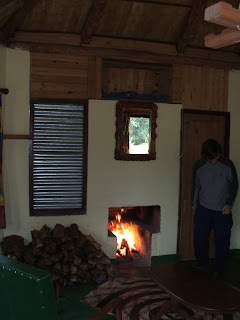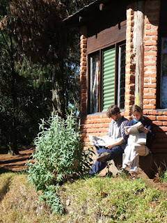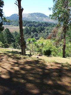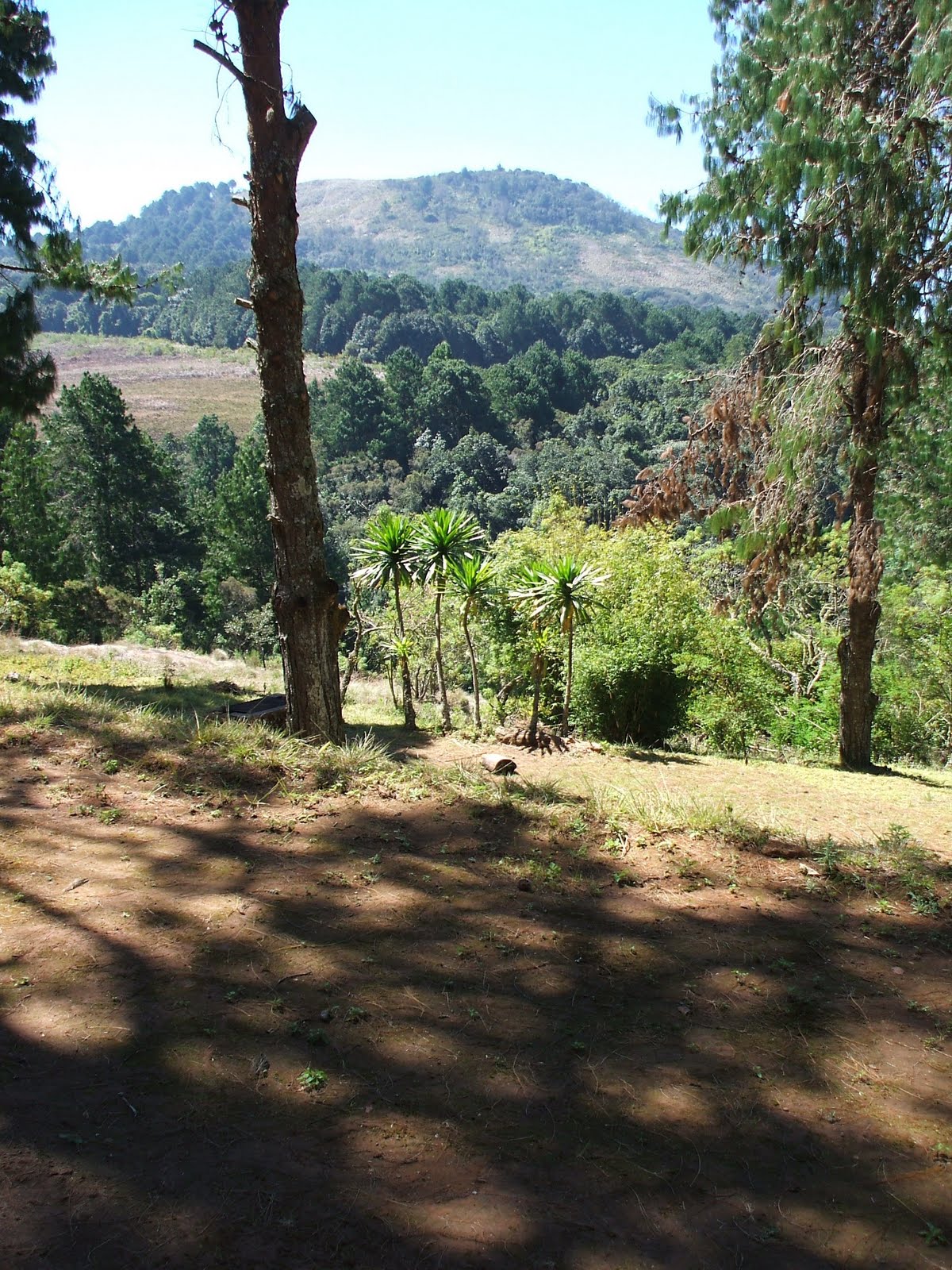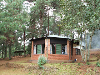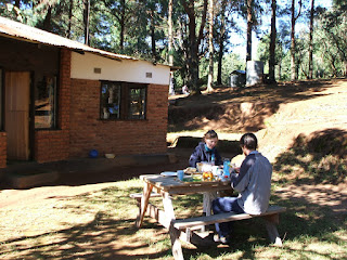 I took a long weekend and we headed to Zomba plateau for 2 nights. When we left Bangwe (public transport all the way) the rain was still coming down and the mud was thick, but that was the last we saw of the rain. We arrived in a cool but dry Zomba and did some shopping and arranged a taxi to take us from the town up to the plateau. We were to rent a hut owned by the people who run the stables at the plateau edge. The taxi took us to the stables where we were warmly greeted by the owners and their huge dog. They then piled us into a landrover and we headed up the rough tracks to the other, higher side of the plateau where the hut was situated. The hut keeper had been instructed to get the fire going as it had been so cold recently, and the hut had not seen much use. When we got there the fire was roaring and the place heating up. It had a living/sleeping room (with 2 single beds which had been made into a double, so unfortunately Ian was relegated to the floor infront of the fire), a kitchen and a bathroom. They had an ingeniously simple method of heating water for the shower and kitchen, which was similar to Ronan and Sam’s hot tub – a fire under an old oil drum, but with no pump, just convection to draw the water from the tank out to the shower or tap. The atmosphere at the hut was great, with old paraffin hurricane lanterns, the roaring fire and the mist all around (but clearing). The next morning we awoke to absolutely clear blue skies. Our wee walk in the morning, after a relax in the sun to warm our bones from the chilly night, took us to Chingwe’s hole. This is a natural deep cave shaft vertically dropping into the hill at the plateau’s edge. Quite interesting to see, but the views were better – out to Liwonde national park and the shire valley on one side, and Mulanje (which SVA were climbing) and lake Chilwa on the other. And immediately around us, a landscape akin to the borders, with open grassland and forestry plantations. The reservoir at the plateau edge completed the European picture! I gather this is used for hydro power, but I’m not 100% sure.